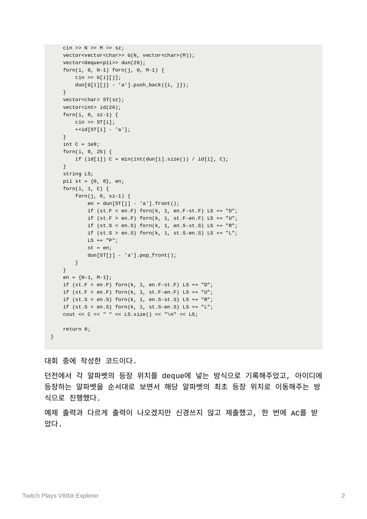 다음으로 저는 캐티님의 조언에 따라 F번, 빙하님은 E번, 캐티님은 D번을 잡았습니다. 다행히 F번은 별다른 알고리즘 지식을 요구하지 않는 일명 빡구현 문제였고 실수 없이 구현하면서 59분에 솔브합니다.